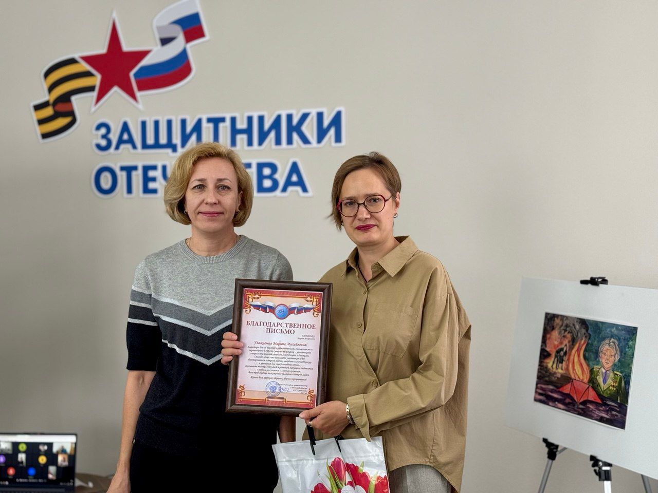 20 августа Уполномоченный по правам человека в Томской области Елена Карташова вручила благодарственные письма сотрудникам филиала Государственного фонда поддержки участников специальной военной операции «Защитники Отечества» по Томской области: Шайдо Татьяне Николаевне - социальному координатору фонда в Зырянском районе Томской области, и Даниленко Марине Михайловне - социальному координатору в г. Томске.